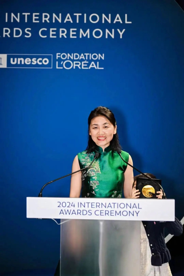 大家晚上好。我十分荣幸获得2024年欧莱雅-联合国教科文组织“世界杰出女科学家成就奖”。这份荣誉不仅是对我个人努力的认可;对一路支持并激励我的人们而言,也值得庆贺。