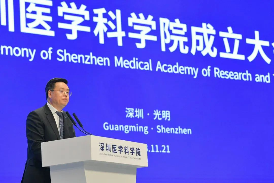 深圳市委副书记、市长覃伟中代表市委市政府向医学科学院的成立表示祝贺。他说,深圳将深入贯彻落实习近平总书记关于健康中国建设和科技自立自强的重要论述,大力推动医疗卫生事业高质量发展,加强生命科学与医学领域科技创新,全力支持深圳医学科学院打造全新机制的高端医疗卫生科研机构,加快建设从基础研究到临床救治一体化的世界级医疗卫生高地。希望深圳医学科学院勇于争创一流、锐意改革创新,积极探索新的科研管理体制,加快与深圳湾实验室一体化融合发展,从解决影响人民生命健康的重大问题出发,加强原创性引领性科研攻关,勇攀世界医学科学高峰,为推动生命健康高水平科技自立自强、促进人类医学科学进步作出积极贡献。