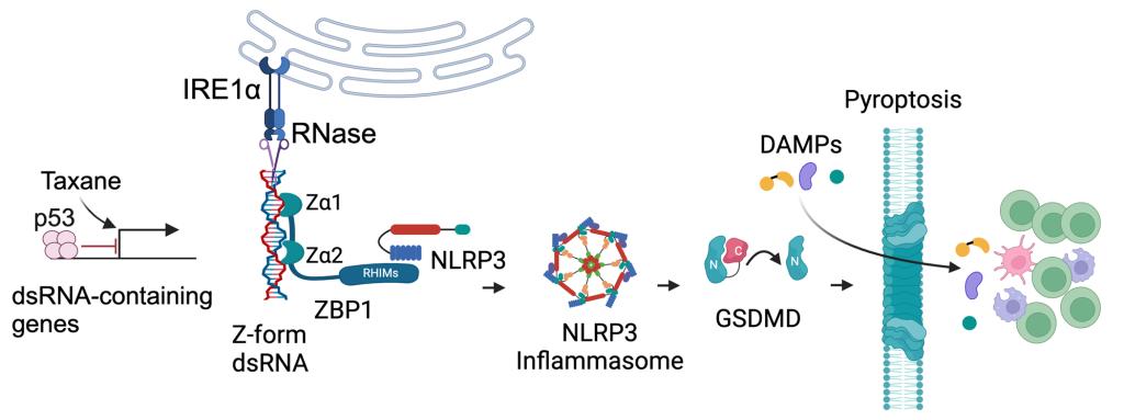 The ancient ER stress sensorIRE1a RNase silences taxane-inducedimmunogenic z-typedouble-stranded RNA (dsRNA)through regulated IRE1-dependent decay (RIDD) to prevent NLRP3 inflammasome-dependent pyroptosis.Inhibition of IRE1aby ORIN1001inTrp53-/-TNBC allows taxane to induce extensive dsRNAs that are sensed by ZBP1,which in turn activates NLRP3-GSDMD-mediated pyroptosis. Consequently, IRE1a RNase inhibitor plus taxaneconverts PD-L1-negative, ICI-unresponsive TNBC tumors into PD-L1high immunogenic tumors that arehyper-sensitive to ICI.