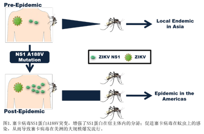 In this study, we found the amino acid substitution from Alanine to Valine at the 188th position of ZIKV NS1 protein promote the NS1 secretion in the host circulation system. The increased NS1 proteins were ingested by mosquito during its blood meal and inhibit the immune response in mosquito mid-gut, benefit the infection of ZIKV in mosquito. The number of ZIKV-infected mosquitoes increased in the environment and promote its transmission in nature. This study revealed the reason of ZIKV epidemic in the south Americas in 2017.