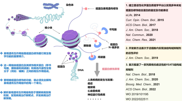 The research of Dr. Xin Li focuses on the development of chemical tools and methods to resolve the biological significance of histone epigenetic modifications and explore new strategies to target abnormal histone modifications for disease treatment. His main academic achievements include: (1) the development and application of a universal chemical proteomics platform that enables the identification and functional characterization of crotonylation and other modifications-mediated interaction networks to elucidate their regulatory mechanisms and biological significance; the development of the first-in-class YEATS domain inhibitors with anticancer activity, providing a series of lead compounds for drug discovery campaigns targeting the YEATS domain; and the development of the first method to evaluate the activity of bromodomain inhibitors in living cells, facilitating the further development of bromodomain inhibitors. Dr. Li has published more than 20 papers in Nat. Chem. Biol., J. Am. Chem. Soc., Nat. Commun., Acc. Chem. Res., etc.