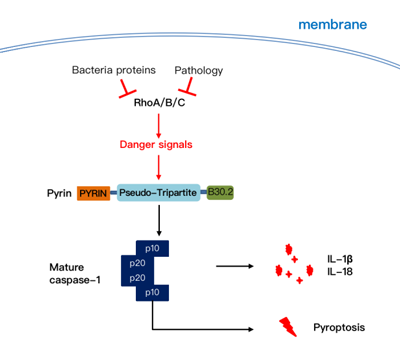 The modification of Rho family proteins could be induced by bacteria or host pathology. The resulting danger signals are detected by a novel pattern recognition receptor, Pyrin, and trigger the activation of inflammasome.