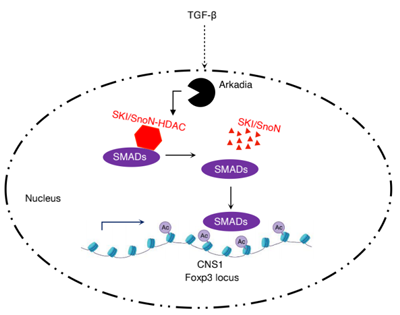 In response to TGF-β stimuli, Arkadia induces the degradation of SMAD proteins-bound SKI and SnoN, resulting the inactivation of HDAC and maintenance of histone acetylation. SMADs-medated transcriptional complexes further promote the expression of Foxp3.