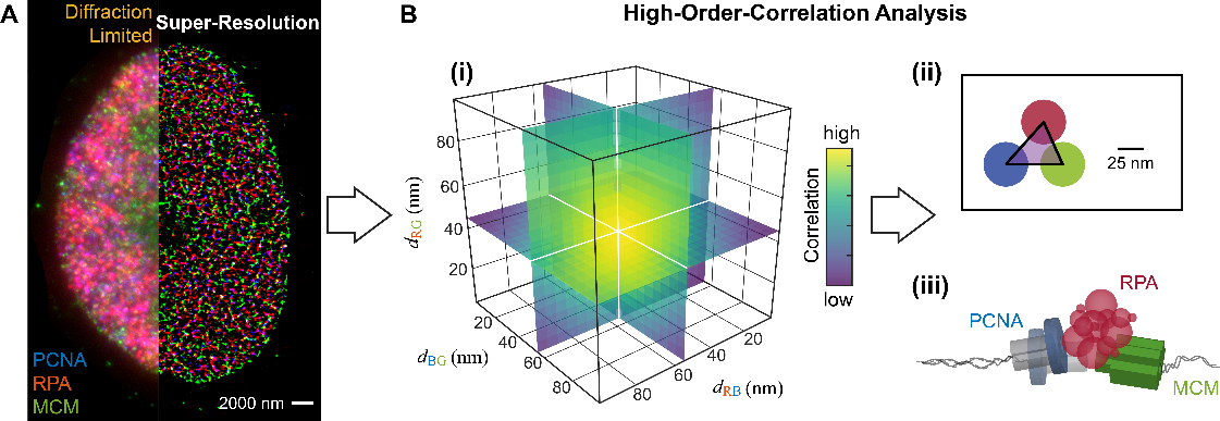 (A) Multi-Color Super-Resolution imaging provides nanoscale spatial information. (B) The Triple-Correlation Function (TCF) quantifies the spatial organization of the molecular complex: (i) The TCF plots the relative probability density as a function of the pairwise distances of the three examined species; (ii) The most probable configuration obtained from the TCF profile; (iii) Quantification of the spatial organization of the molecular complex.