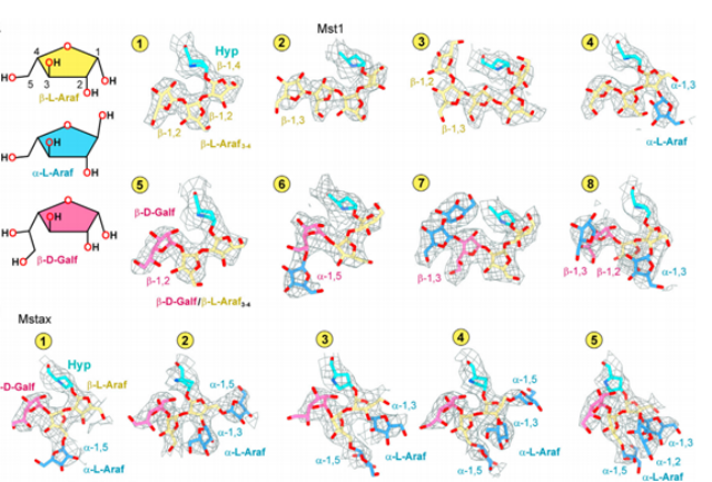 研究显示,Mst1蛋白1,854-1,932的片段是富含Ser-Pro重复序列的PPII 螺旋。电镜密度显示了清晰的与羟化脯氨酸 (Hyp) 残基连接的聚糖密度。这种Hyp重复序列广泛存在于植物与藻类富含Hyp的糖蛋白中。电镜密度分析揭示,其基本单元所具有的典型3 - 4个β- l -呋喃型阿拉伯糖单糖分子 (β-L-Araf3-4) 通过O -连接糖基化与Hyp的羟基共价成键,从而形成缠绕在PPII螺旋周围的高度有序糖鞘结构;其中第一个β-L-Araf与Hyp羟基形成β-1-4糖苷键,其余糖环分子间以β-1-2或者β-1-3键连。连续的聚糖分子与羟脯氨酸PPII螺旋一同形成稳定的结构模块,作为天然生物大分子架构组装的结构基础。