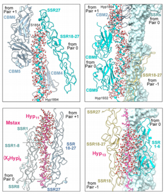 后续针对Mastigoneme进行结构分析发现,聚糖分子直接介导了整个复合物的组装。除了包裹在Mst1纤维和Mstax核心轴的表面外,大量的聚糖分子占据了整个Mastigoneme分子量的20%-25%,并直接参与分子内和分子间堆积的形成,介导了整个复合物的组装。位于Mst1表面的糖类结合模块 (Carbohydrate-Binding Modules, CBMs) 在与PPII螺旋中的阿拉伯糖基相互作用中起着至关重要的作用。具体来说,Mst1的CBM4-6与相邻Mst1分子的PPII螺旋1,854-1,894片段内的阿拉伯聚糖分子形成氢键识别网络。此外,来自Mst1的含二硫键重复模块 (disulfide-bond-containing repeats, SSR) 中,SSR1-8部分与相邻Mst1分子的SSR18-27共同参与了和Mstax一个MHR的Hyp11以及(X2Hyp)6区域聚糖的相互作用。