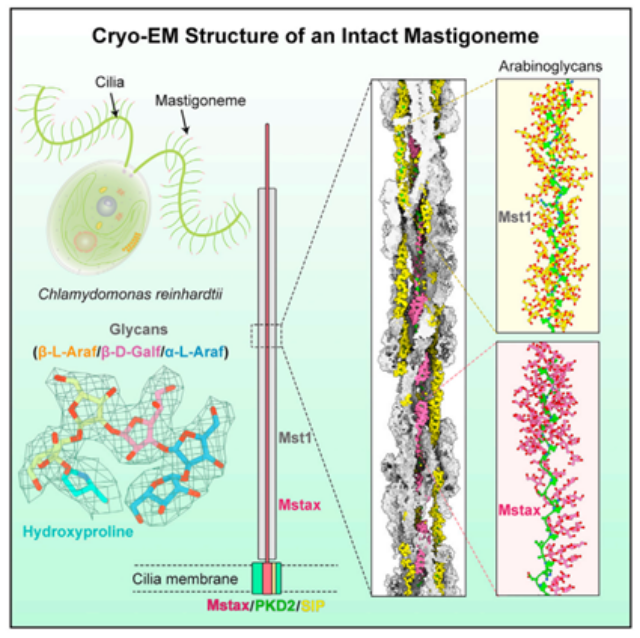 纤绒毛是从纤毛膜向外延伸的一种纤细结构。研究发现,纤绒毛主体形成超级螺旋排布,每个旋转螺旋由四对反平行的纤绒毛样蛋白1 (Mastigoneme-like protein 1, Mst1) 组成。Mst1含有II型多聚羟基脯氨酸 (Hyp) 螺旋二级结构 (PPII),该二级结构被大量阿拉伯糖聚糖包被。此外,结合冷冻电镜密度、蛋白质质谱和生信分析,研究人员鉴定出Mastigoneme的新核心组分——纤绒毛轴心蛋白 (Mastigoneme-specific axial protein, Mstax),其同样富含大量复杂糖基化修饰,并含有PKD2样跨膜结构域。Mstax具有近8,000个氨基酸残基,从纤毛膜区域延伸到纤绒毛的远端,作为整个Mastigoneme组装的骨架分子。该研究为理解天然生物架构 (Bio-architectures) 中蛋白质和糖类分子形成复合物的相互作用模式提供了理论基础。