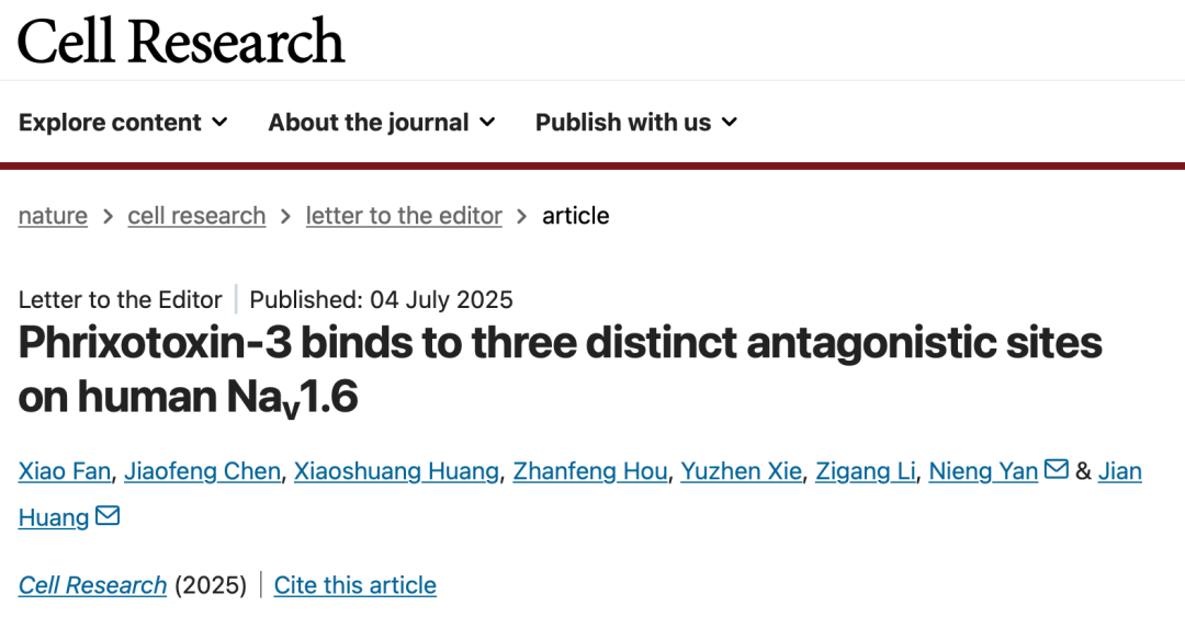 北京时间2025年7月4日,深圳医学科学院颜宁/黄健团队在Cell Research(《细胞研究》)期刊在线发表了题为Phrixotoxin-3 binds to three distinct antagonistic sites on human Nav1.6的研究论文,首次揭示蜘蛛毒素Phrixotoxin-3(PaurTx3)通过三位点协同调控人源电压门控钠通道Nav1.6,为多肽类药物的设计提供了新思路。