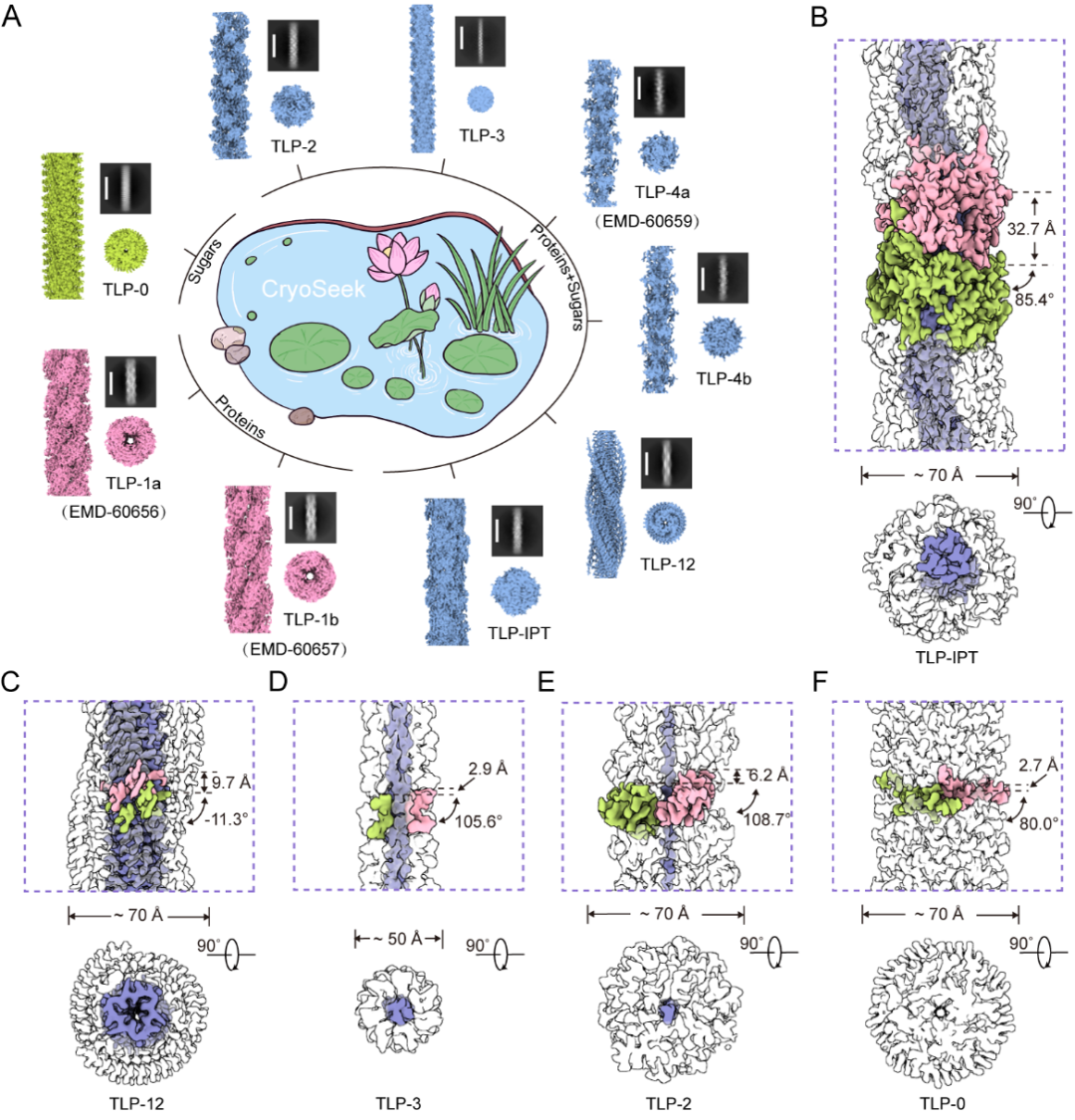 图2A. 目前,在清华荷塘水样中共解析出9种高分辨率纤维结构,依据其蛋白组成可分为三种类型,分别为蛋白纤维(TLP-1a/b)、以蛋白为核心的糖纤维(TLP-2/3/4a/4b/12/IPT)和全部由糖组成的纤维(TLP-0);