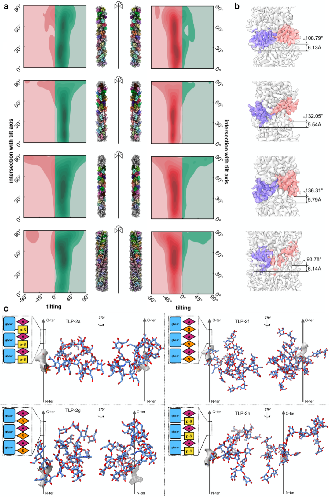 图4a. Ahaha分析了四种糖质纤维的颗粒倾斜角的热力图绿色表示颗粒倾斜角与给定样品倾斜角一致,从而表示其三维结构手性正确,红色则表示相反从而手性错误。作为对照,使用了相反的螺旋转角(twist)参数与手性相反的初始模型进行螺旋精修时,Ahaha能够如预期地给出手性错误的结果。