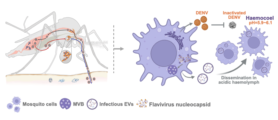 该研究发现,埃及伊蚊、白纹伊蚊、致倦库蚊等主要病媒蚊的血淋巴呈酸性环境(pH 5.9-6.1)。登革病毒等蚊媒病毒的囊膜蛋白在pH<6.5的情况下会发生不可逆的结构变化,进入脱衣壳的状态,从而使病毒颗粒彻底失活,提示蚊媒病毒必须通过一种不依赖传统病毒颗粒的非经典感染形式进行感染扩散,才能在蚊虫体内建立系统性感染。研究进一步发现,蚊虫细胞外囊泡(Extracellular vesicles, EVs)的一种蛋白因子VCP可以直接结合病毒的衣壳蛋白,从而将病毒的感染性物质—核衣壳定向分选到细胞外囊泡中,形成感染性细胞外囊泡(图1)。