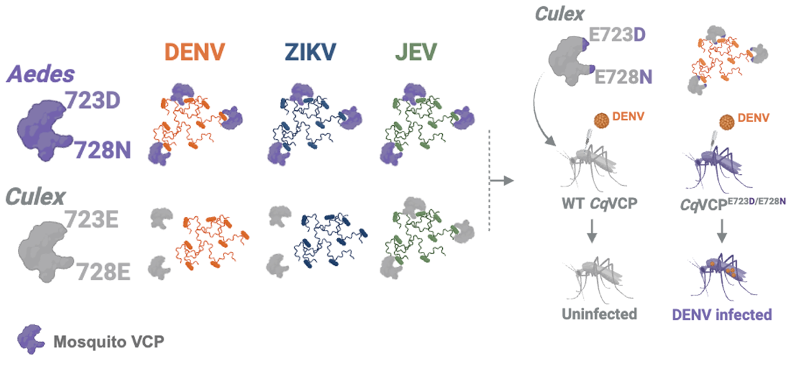 自然条件下,不同的蚊媒病毒由特定的蚊虫传播,这种感染的种属特异性是决定蚊媒传染病流行区域及流行规模的决定性因素,但其分子机制却未被阐明。通过多种生化实验、生物信息预测与筛选验证,发现不同蚊虫的VCP蛋白两个氨基酸位点的差异是病毒Capsid衣壳蛋白与蚊虫VCP蛋白结合强弱的关键因素,是决定不同蚊虫对不同病毒易感性的关键分子开关(图2)。