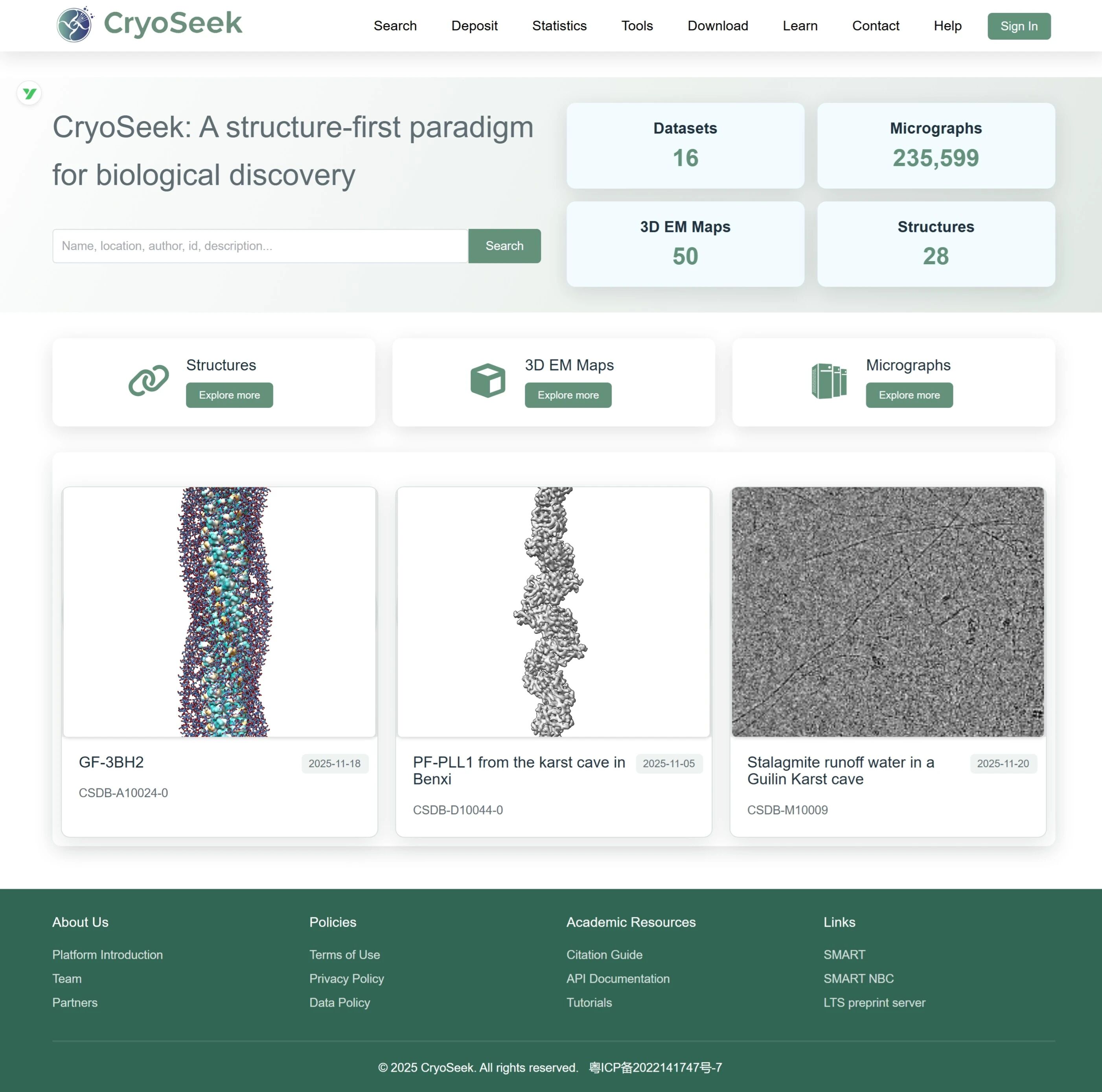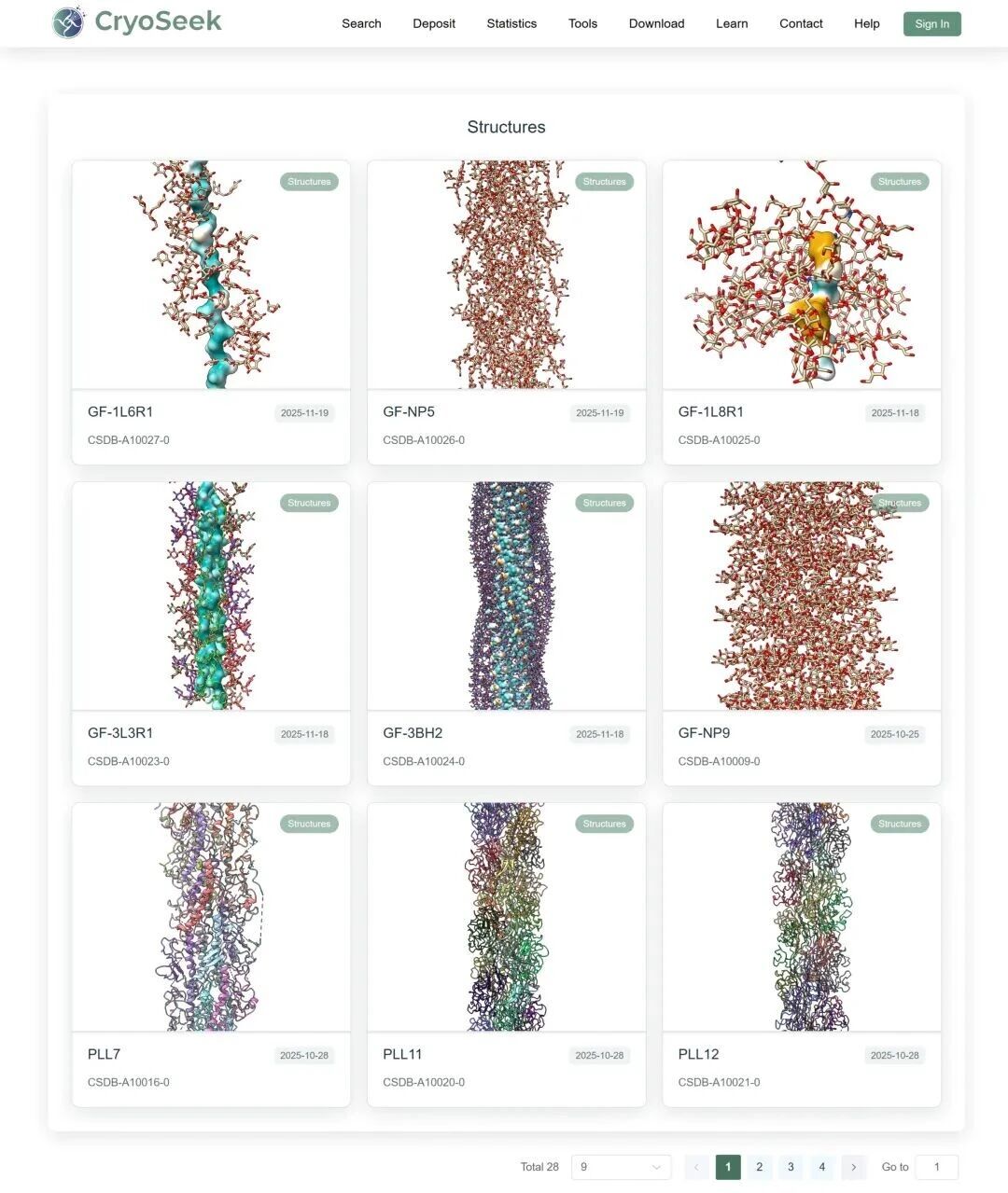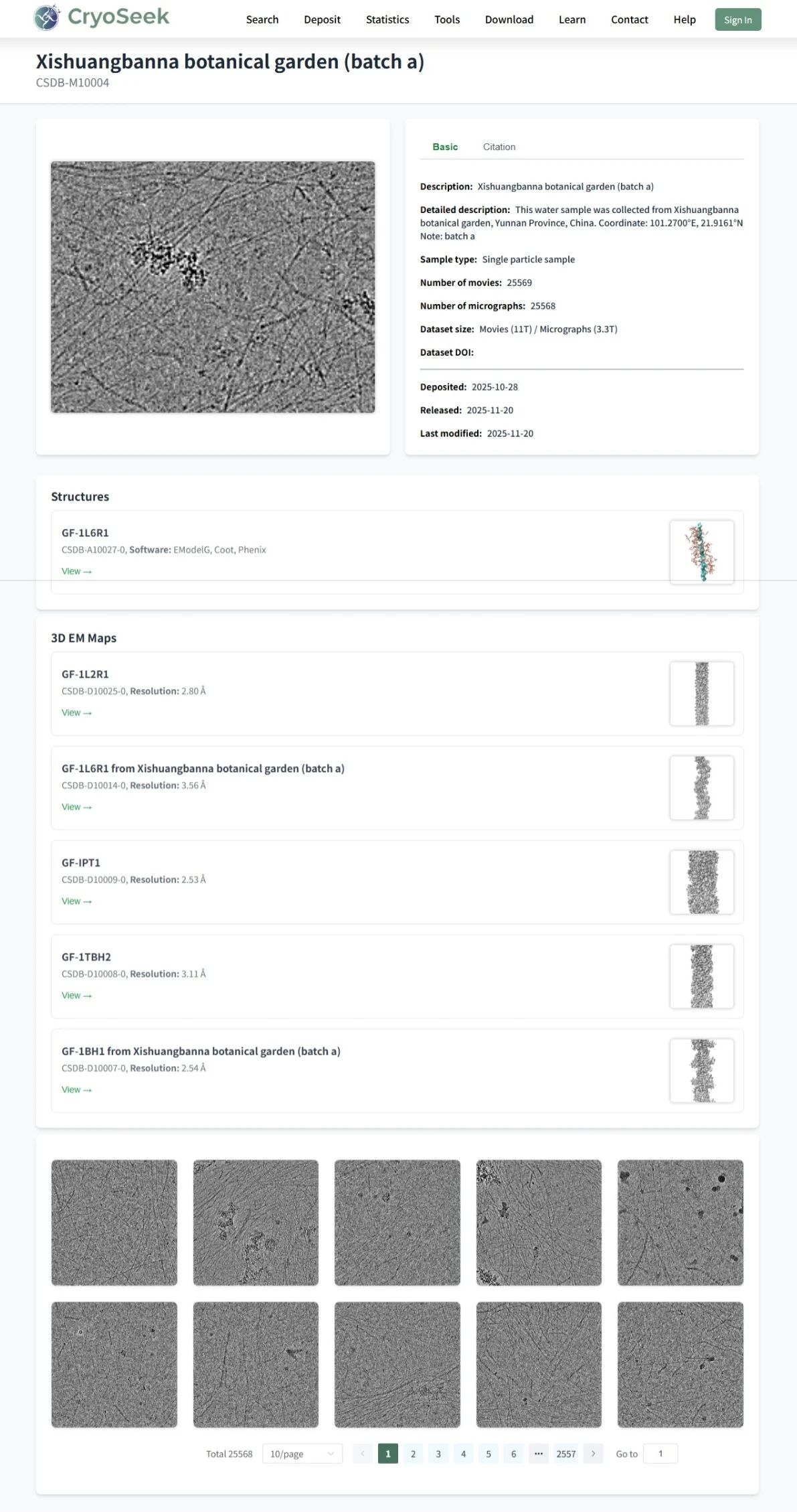 在近期研究中,颜宁团队与胡名旭团队合作开发了高通量CryoSeek结构测定技术体系,大幅提升了结构解析效率,初步验证了该策略在大规模应用中的技术可行性。随着CryoSeek策略在多种环境样本中的广泛使用,所解析结构的数量与复杂度迅速增加,传统的数据管理与分析方法已难以适应高通量发现的需求。为推动数据共享与科研协作,助力中国在科研数据治理领域发挥引领作用,并使CryoSeek策略真正成为服务全球生命科学研究的公共工具,颜宁团队与胡名旭团队携手在深圳医学科学院建立了CryoSeek数据库(https://cryoseek.org.cn)。