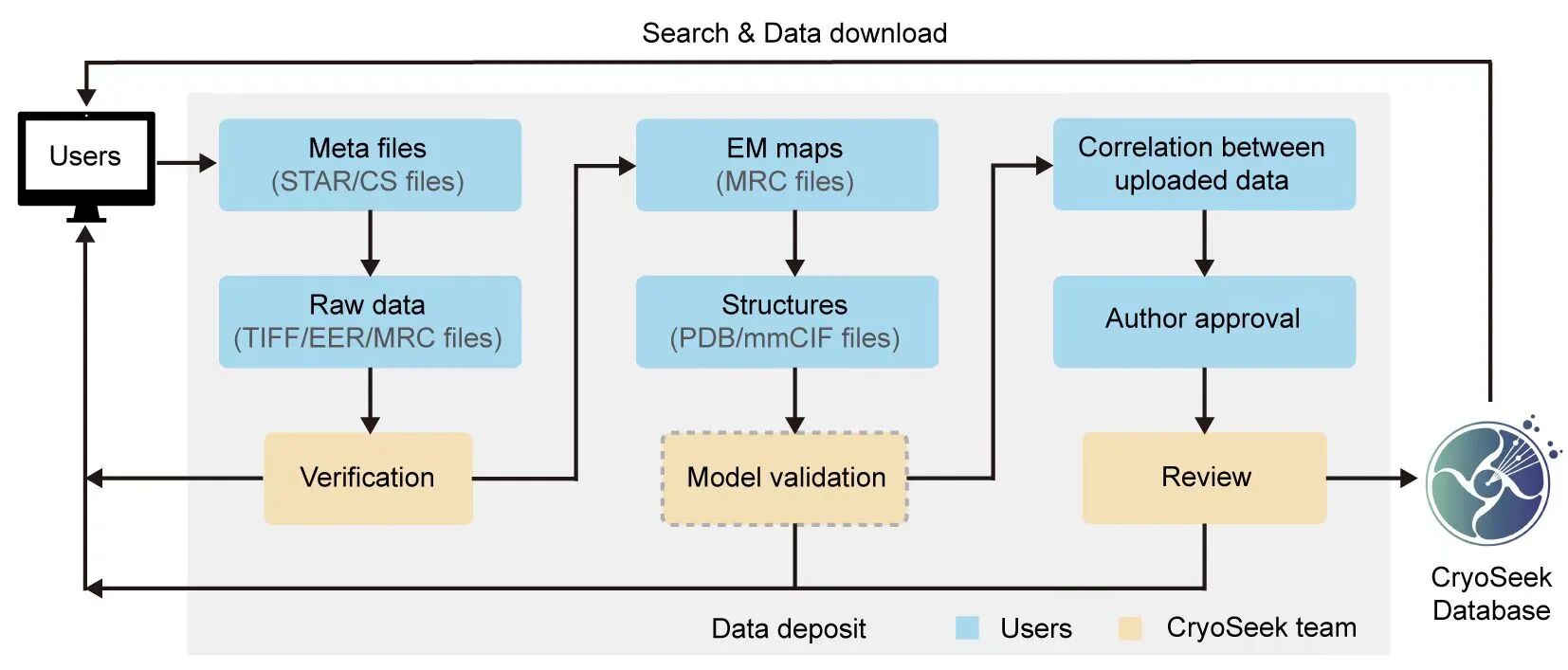 CryoSeek数据平台同样提供了数据上传共享的功能(图9)。其数据提交流程兼顾严谨性与协作性:用户可依次上传元数据文件,系统自动识别数据集内部潜在关联并进行验证;所有条目经管理员团队人工审核与注释后,返回用户确认,最终公开发布。