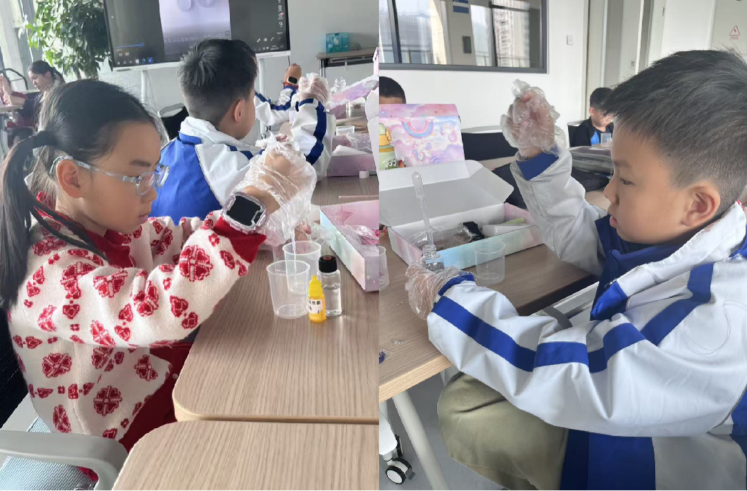 经过耐心的等待,当琥珀作品逐渐凝固成型,他们举起这枚小小的宝藏,眼中闪烁着身为小创作者的骄傲与欣喜。科学探索不止于动手。孩子们还第一次接触移液枪,在“插枪头”的环节中全神贯注,学习精准操作。
