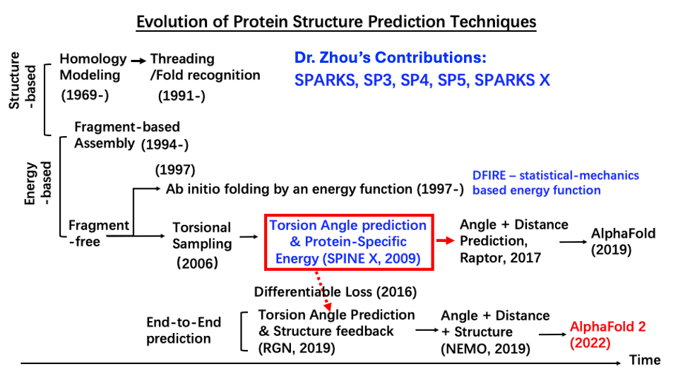 · Pioneered prediction of continuous backbone dihedral angles using shallow and deep learning, enabling end-to-end protein structure prediction (Fig. 1). This development directly underpinned Nobel-prize-winning technique AlphaFold 2 for high-accuracy structure prediction.