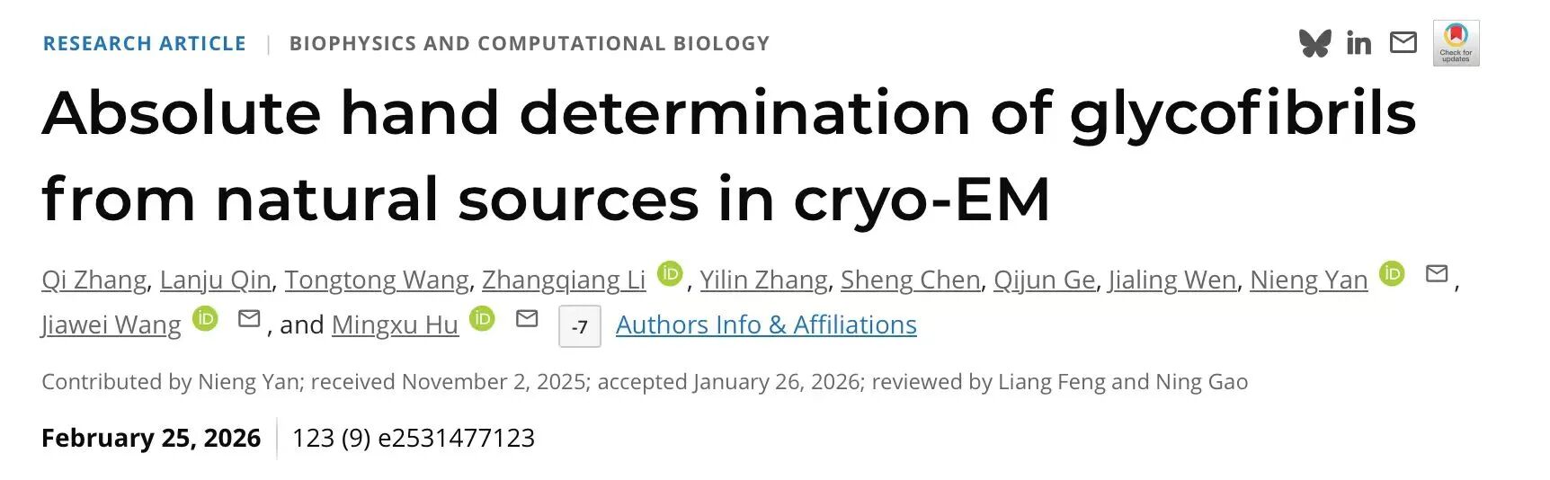 北京时间2026年2月26日,胡名旭、王佳伟、颜宁及其团队成员在PNAS上共同发表了“冷冻电子显微学中自然来源糖质纤维的绝对手性确定”(Absolute hand determination of glycofibrils from natural sources in cryo-EM)的研究论文。