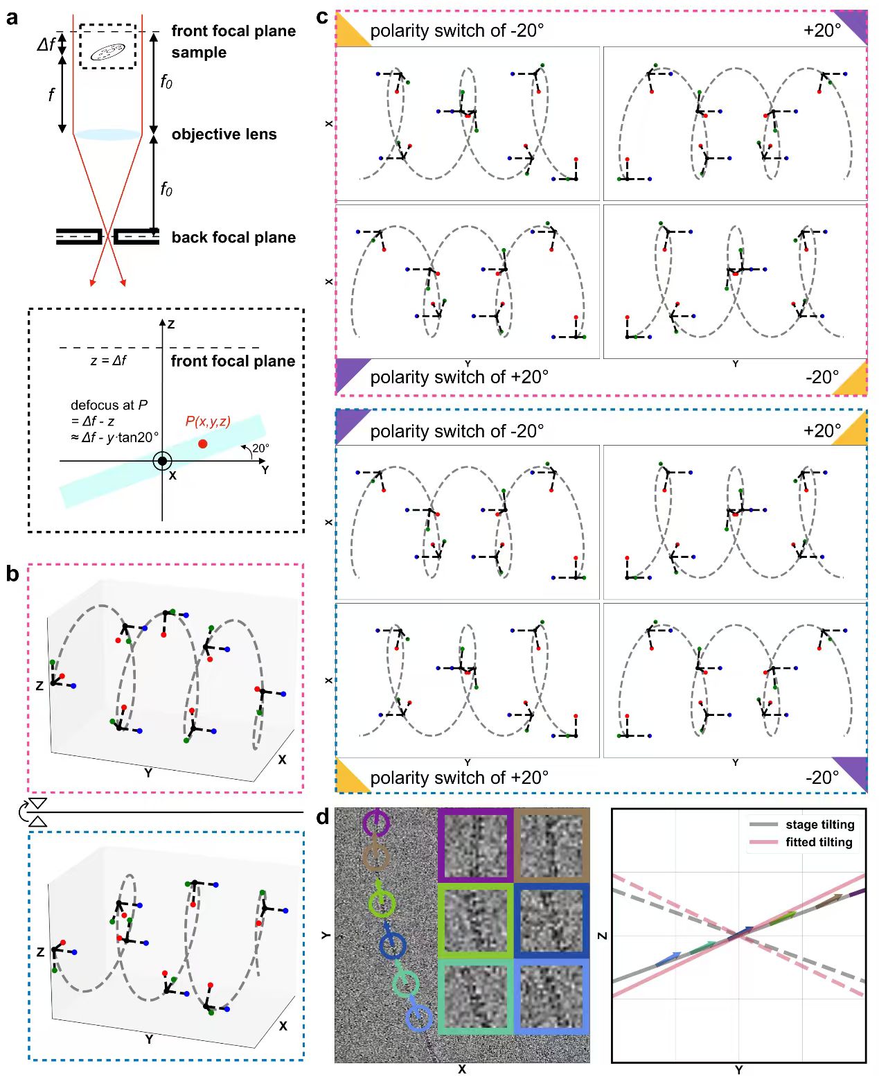 Ahaha的原理如图2所示。互为镜像的螺旋结构(图2b),在相同的倾角(例如+20°)下具有不同的投影(图2c),而在相反的倾角(例如+20°和-20°)下具有相同的投影(图2c)。由此可知,得到相同的投影图像时,不同手性的螺旋应当具有相反的倾角。另一方面,由于螺旋结构的糖质纤维必然平躺在样品平面,其倾斜角度必然平行于样品本身。通过分析高分辨率螺旋重构中的颗粒倾斜角与样品本身的倾斜角是否一致,可以决定重构的高分辨率密度图的手性是否正确(图2d)。当颗粒倾斜角大致平行于给定的样品倾斜角时,则认为所重构的螺旋的手性是正确的,反之,则认为所重构的螺旋的手性是相反的。同时,作为Ahaha分析的一个补充,可以使用颗粒的离焦参数(例如从CryoSPARC的patch CTF中获得)交叉验证给定的样品倾斜是否正确(图2a)。