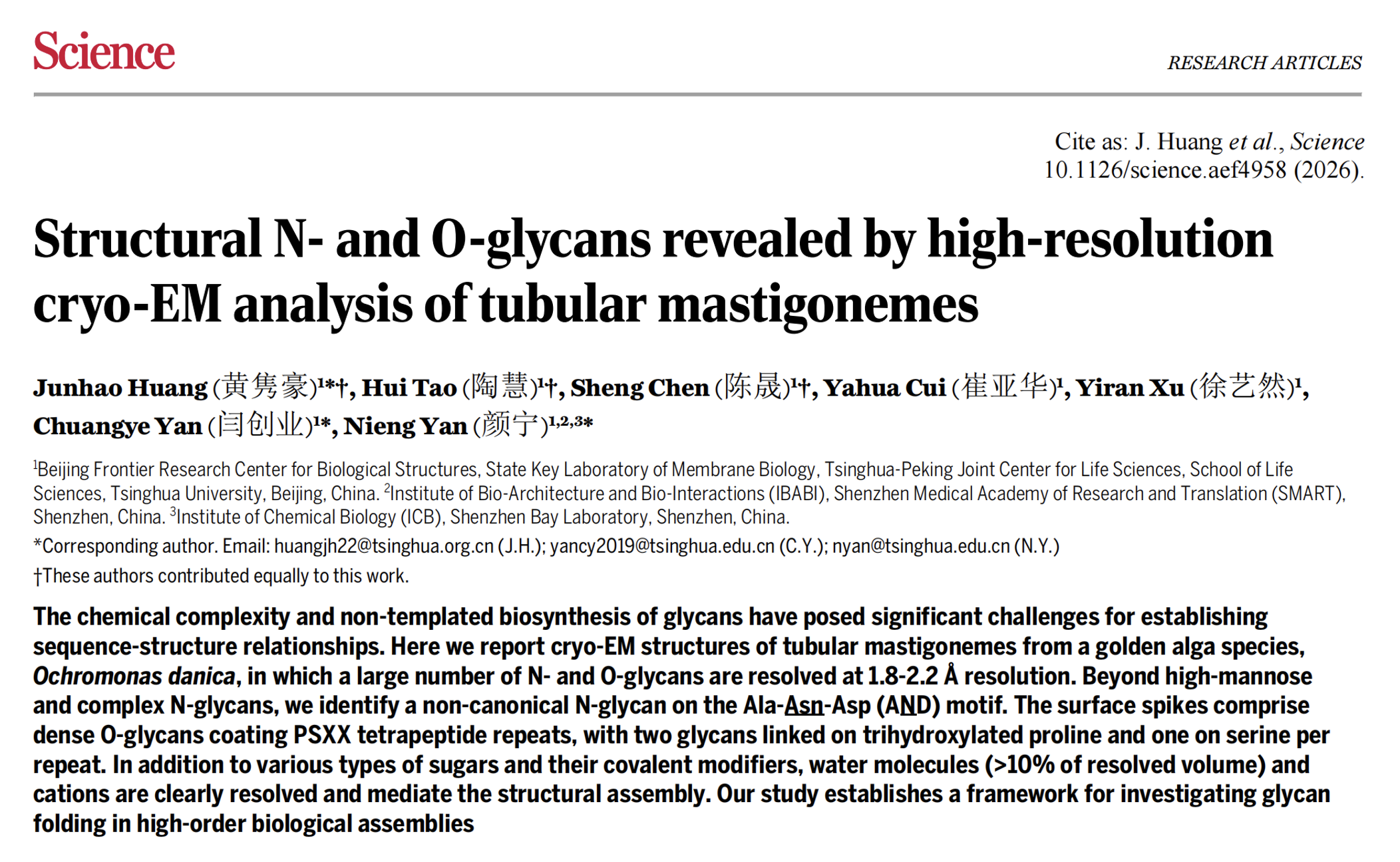 当地时间2026年4月23日,颜宁、黄隽豪、闫创业等在国际期刊Science上发表最新研究成果,论文标题为“高分辨率冷冻电镜解析揭示管状纤绒毛中结构N-和O-糖质(Structural N- and O-glycans revealed by high-resolution cryo-EM analysis of tubular mastigonemes)”。研究团队以金藻 Ochromonas danica 的管状纤绒毛(T-mastigoneme)糖质-蛋白质复合物为研究对象,建立了整合高分辨率冷冻电镜、糖蛋白质组学与人工智能建模的综合研究策略,获得了整体糖质分辨率约2 Å(即0.2纳米),核心局部最高达 1.8 Å 的超高分辨率三维电镜密度图,进一步将天然糖质复合物的研究推进至近原子分辨率层面。