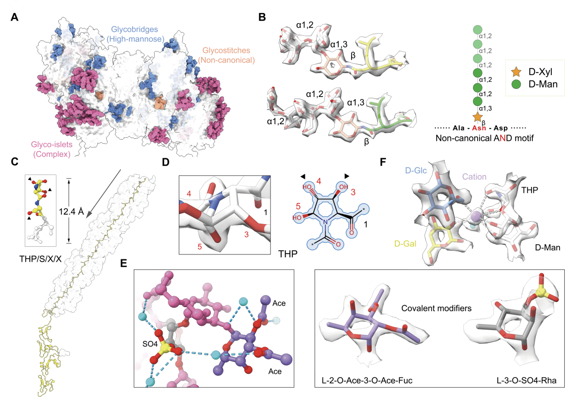 进一步的结构分析表明,不同类型的N-糖质在该体系中承担着彼此明确区分、各不相同的结构功能。研究系统提出了三种糖质介导大分子组装的功能模式:其一,“糖质缝合”(glycostitch)通过非经典AND基序糖链形成规则螺旋样构象,稳定重复单元内部的亚基界面;其二,“糖质桥”(glycobridge)主要由高甘露糖型结构介导,跨越重复单元形成长程相互作用,并表现出一定的跨物种保守性;其三,“糖质岛”(glyco-islet)以簇状方式分布于复合物表面,通过增加表面积和亲水性提升整体稳定性与可溶性。这些发现突破了将糖质仅视为蛋白质附属修饰的传统认识,表明糖质本身可以直接作为驱动生物大分子折叠与高级组装的关键结构单元。
