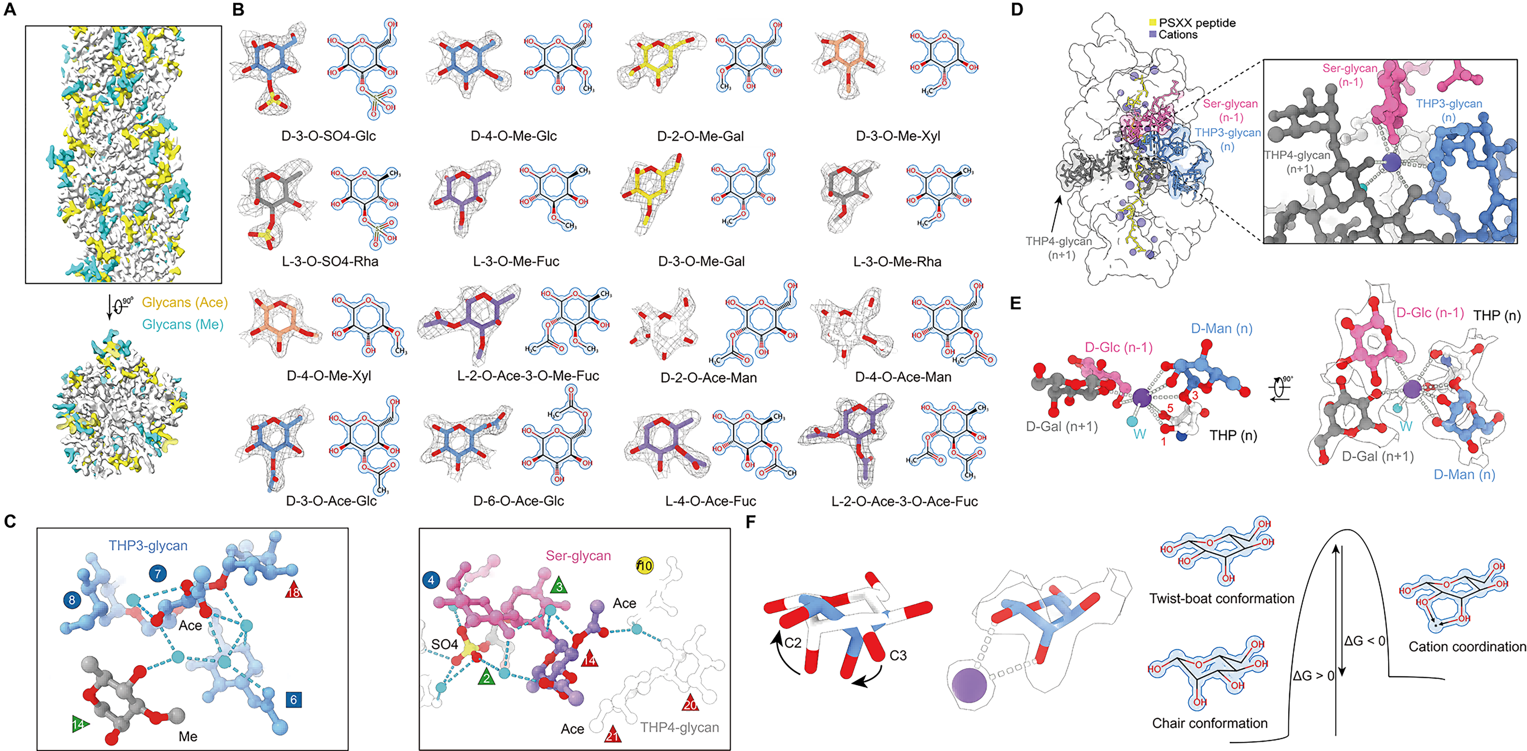 在 O-糖质结构方面,研究进一步解析了基于PSXX四肽重复形成的高级糖质纤维。结构显示,3,4,5-三羟基脯氨酸(THP)和丝氨酸位点被致密糖基化,形成规则排列的表面“糖刺”样突起,并共同构建出稳定的糖质纤维骨架。研究首次在该体系中鉴定出罕见的THP修饰,并精确揭示了由八种单糖及多种共价修饰共同构成的复杂O-糖质折叠形式。更为重要的是,高分辨率密度图还揭示出广泛存在的有序水分子网络和多价阳离子配位中心。这些此前难以被直接观测的结构因素,通过氢键网络和配位作用显著增强了糖质之间的相互作用。其中,金属阳离子可介导跨越重复单元的八配位网络,增强糖质螺旋核心的机械刚性,并伴随特征性的甘露糖“扭船式”构象翻转,以实现局部能量补偿,为理解复杂糖质装配体稳定性的物理化学基础提供了直接实验依据。