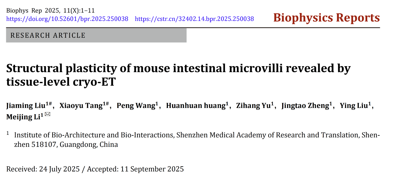 近日,深圳医学科学院李美静团队在Biophysics Reports期刊背靠背发表两篇论文,题为“Step-by-step procedure for an optimized serial lift-out cryo-focused ion beam milling technique in tissue analysis”和“Structural plasticity of mouse intestinal microvilli revealed by tissue-level cryo-ET”。