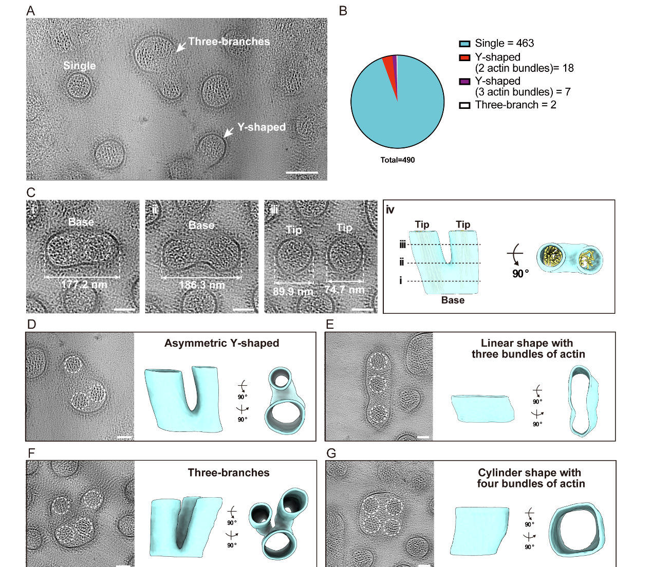 基于上述优化的 Serial-lift-out cryo-FIB 与 Cryo-ET 流程,李美静团队获取了大量小鼠肠道组织的超微结构数据。在这些数据中,研究人员捕获到多种分枝状微绒毛(microvilli)结构——分枝微绒毛的比例明显高于线虫肠道中观察到的类型。该发现提示哺乳动物刷状缘结构存在此前未被充分认识的高度可塑性,并为“微绒毛更新过程中可能存在类分裂机制”的观点提供了直接的结构学证据。