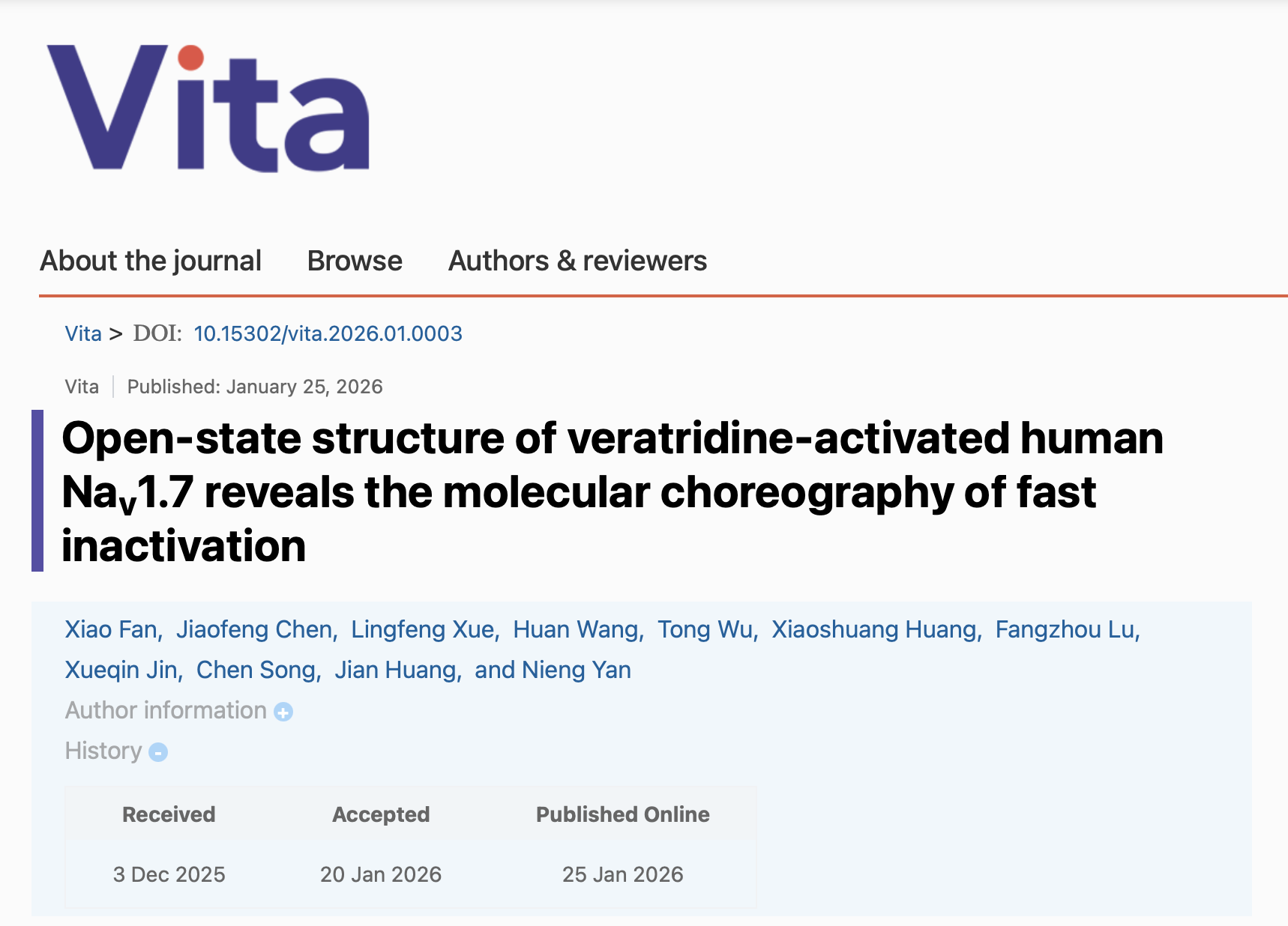 北京时间2026年01月25日,深圳医学科学院颜宁、黄健和范潇团队联合北京大学宋晨团队在Vita首期杂志上发表了题为“Open-state structure of veratridine-activated human Nav1.7 reveals the molecular choreography of fast inactivation”的文章。
