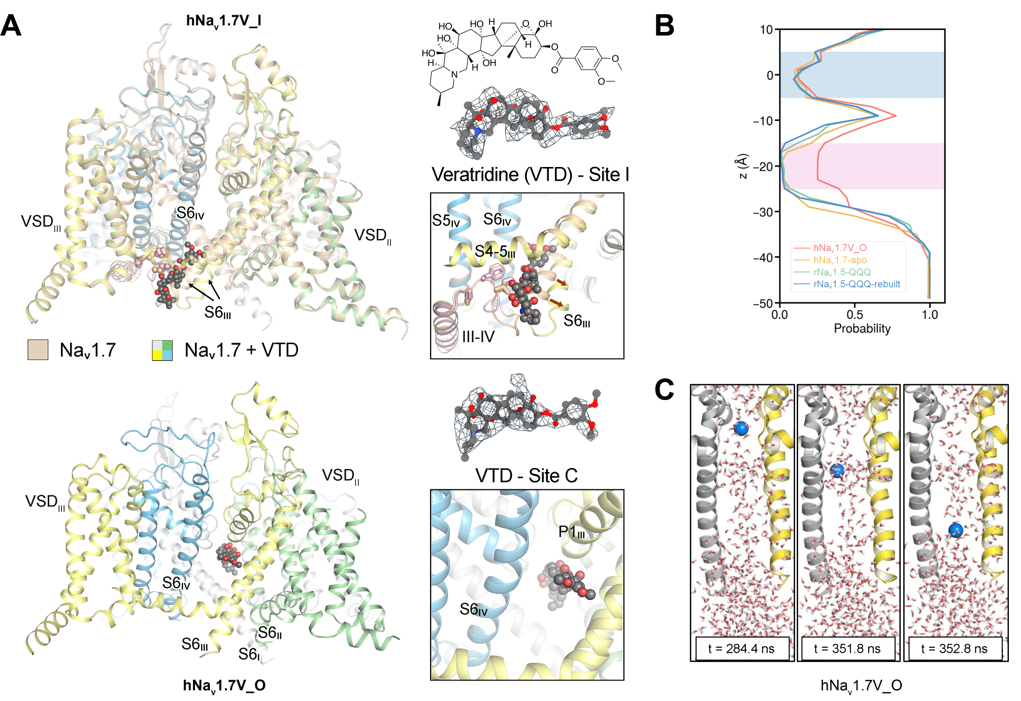文章通过冷冻电镜技术首次解析了人源电压门控钠离子通道Nav1.7在开放状态下的精细三维结构,成功捕获通道开放的关键 “分子瞬间”,为揭示钠通道快速失活的核心机制填补了关键空白。在本研究中,研究团队巧妙引入来源于百合花科植物的脂溶性神经毒素藜芦定(Veratridine)作为钠通道激动剂,成功捕获了两种Nav1.7与藜芦定结合的复合物结构。其中一种构象中,藜芦定嵌入IFM结合角区域(位点I),与之前报道的失活态结构类似;而在另一种构象中,藜芦定贯穿中央空腔(位点C),呈现出激活态构象。在这一构象中,胞侧门控收缩处的孔径达8.2埃,足以容纳7.2埃的水合Na+离子进行渗透。进一步分子动力学模拟结果表明,该构象所对应的通道完全通透,并且在模拟中呈现的电导值与实验结果高度一致,证实该功能性结构的确处于激活开放态。