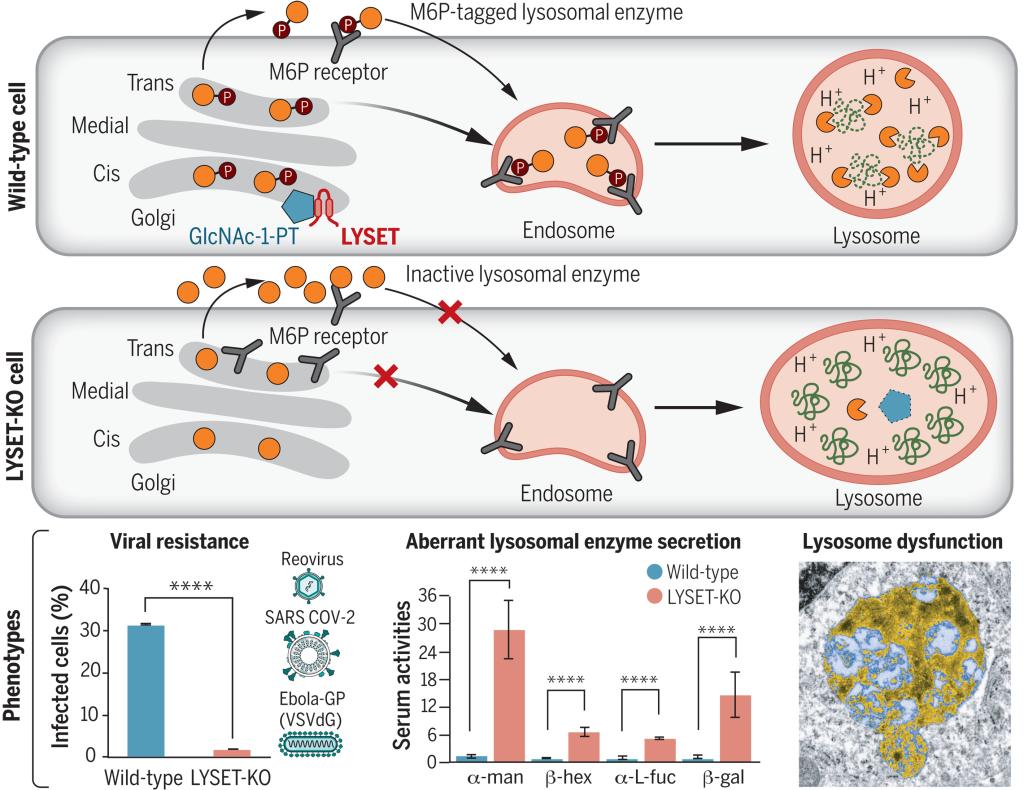 1.发现并命名溶酶体酶运输因子LYSET,揭示其在维持溶酶体稳态和病毒感染中的作用,并阐明其与溶酶体贮积病—Ⅱ型黏多糖贮积症(mucolipidosis II)的致病关联。